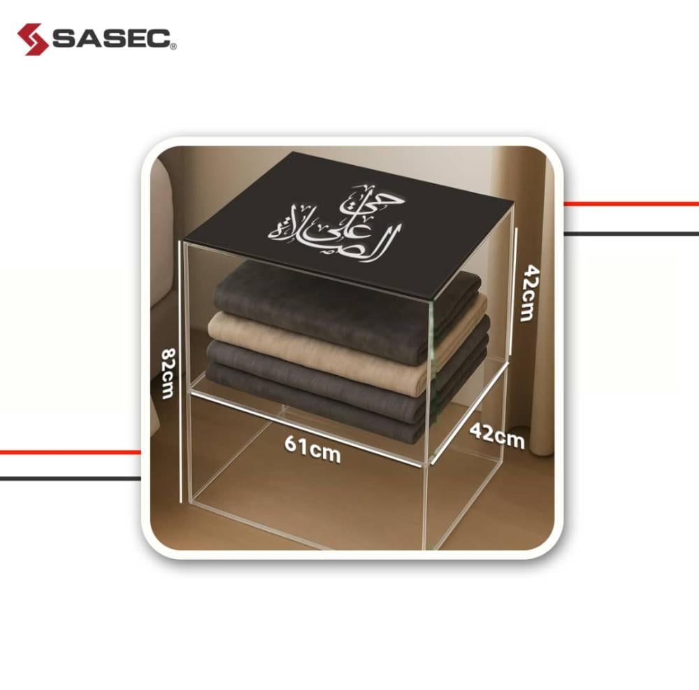 صندوق مصمم خصيصًا لحفظ سجادات الصلاة بطريقة مرتبة وأنيقة، مصنوع من اكريليك شفاف بقواعد اكريليك عالي الجودة بغطاء علوي أنيق مزخرف بعبارة “حي على الصلاة ” بخط عربي جذاب مع إمكانية بتغير الجملة حسب الطلب.